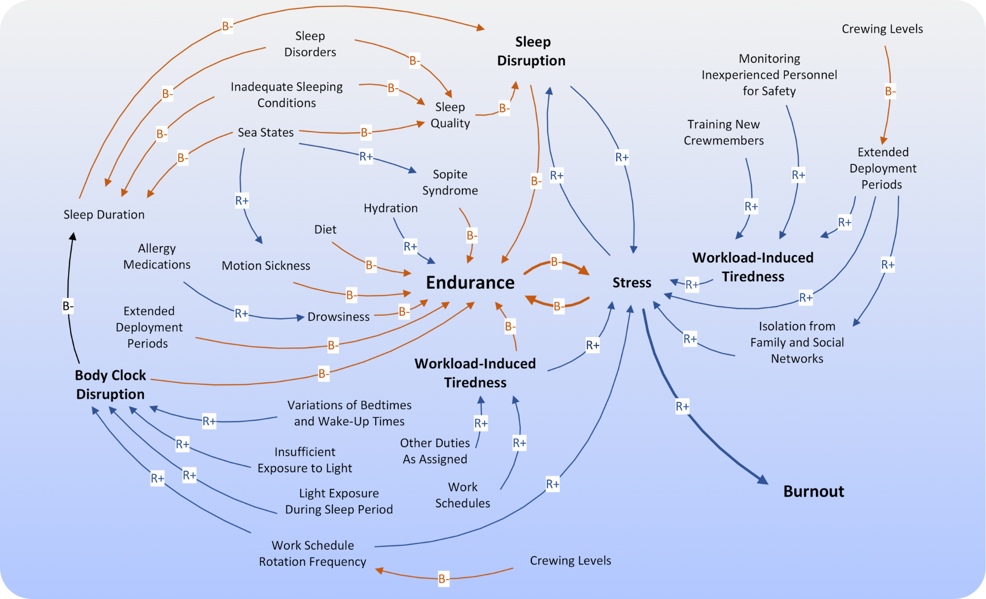 This General System Map (GSM) illustrates various factors affecting human endurance, stress, and burnout, along with their influences and interactions. R+ labels indicate reinforcing influences that enhance elements at the arrowhead, while B- labels denote inverse influences.